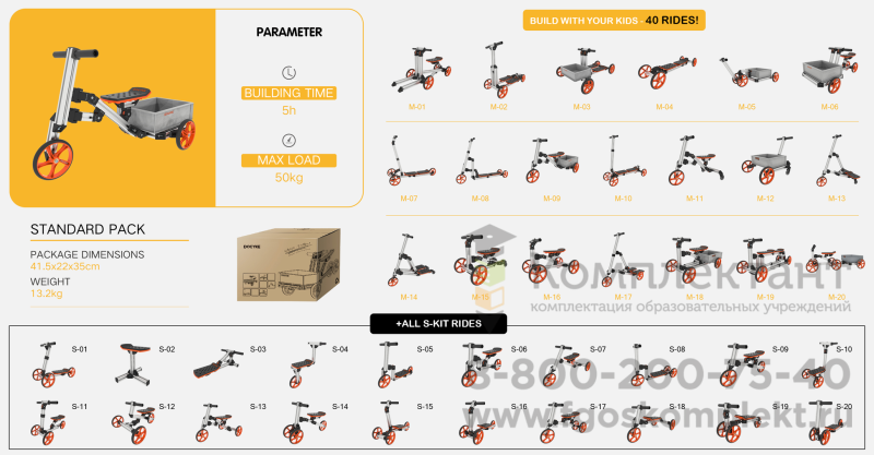 Получите увлекательный опыт вместе со своими детьми, строя разные средства передвижения. Все комплекты DOCYKE полностью совместимы между собой. А детали конструктора выполнены из материалов с повышенной устойчивостью к нагрузкам. Максимально допустимая нагрузка зависит от типа конструктора, для DOCYKE M-KIT - 50кг. Не менее 40 вариантов сборки, количество ограничивает только ваша фантазия. Конструктор DOCYKE объединит всю семью созданием необычного транспорта. В комплект входят соединители, алюминиевые профили, винты и 4 колеса диаметром 20 см.Набор для сборки 40 в 1. (S-Kin + M-Kit)