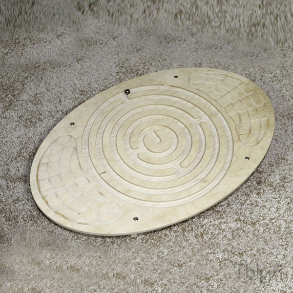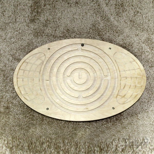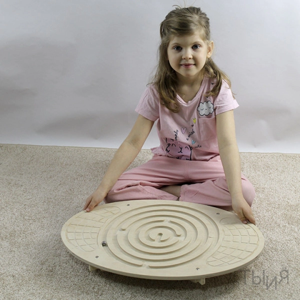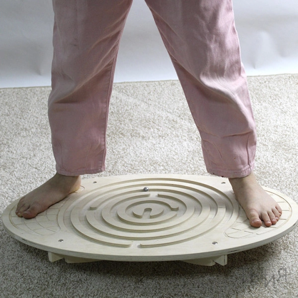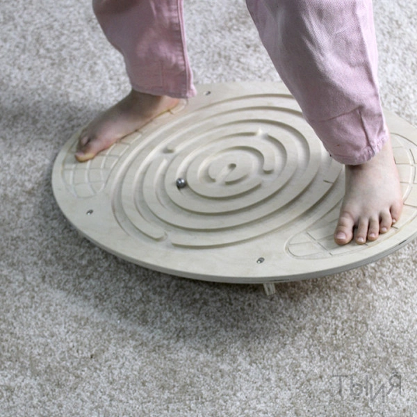 Держа ребенка за руки, помогите встать на тренажер и пройдите несколько раз лабиринт вместе.