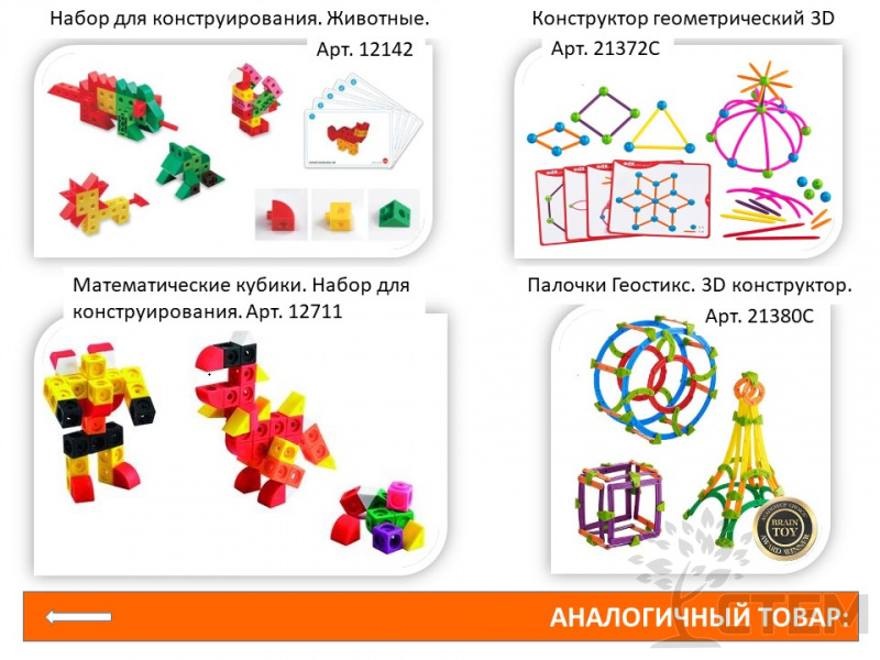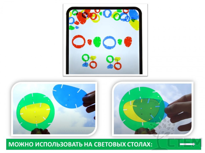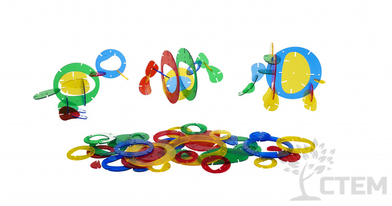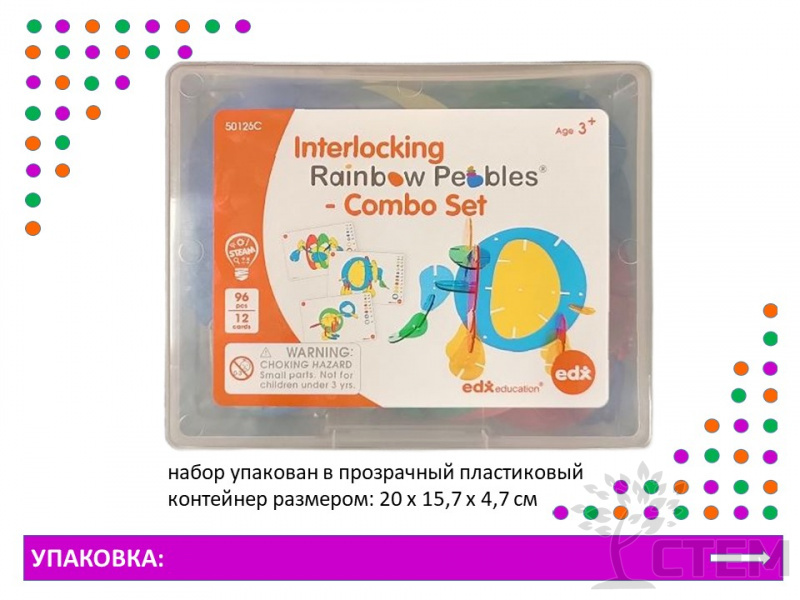Набор включает: 96 деталей 4-х цветов, 12 различных форм и 12 двусторонних карточек с заданиями. Поставляется в пластиковом контейнере.