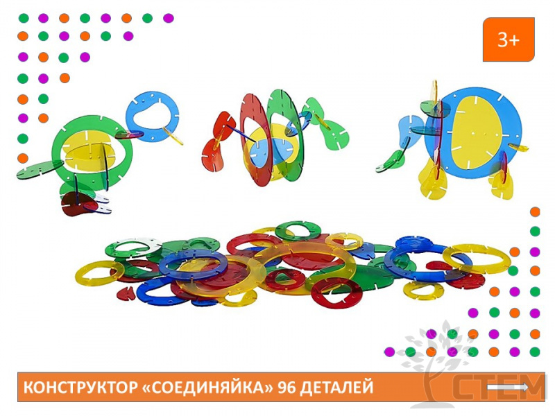 Увлекательный конструктор "Соединяйка" состоит из разноцветных (полупрозрачных) плоских деталей, соединяющихся между собой. По своему замыслу или образцу, ребенок может создавать различные фигуры и конструкции.