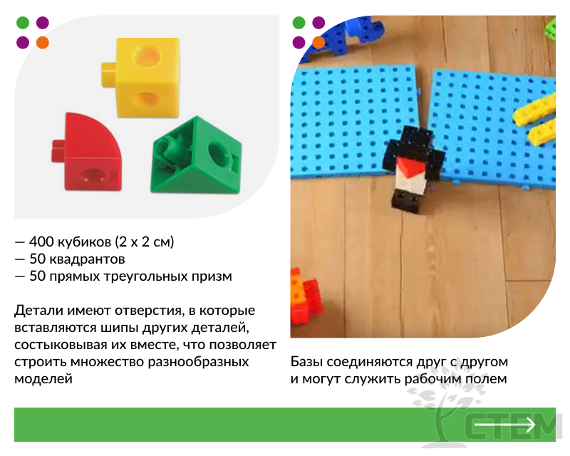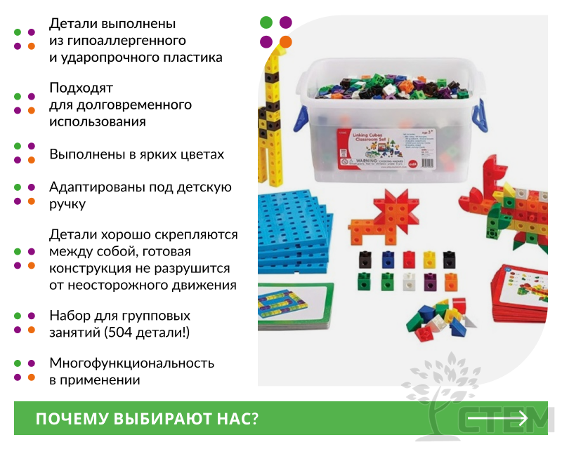 Набор из соединяющихся кубиков применяется для развития мелкой моторики, математических способностей, воображения и творческих навыков.