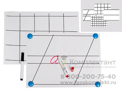 В комплект входят: демонстрационные таблицы – 4 шт., маркеры – 2 шт., магнитные кнопки – 4 шт., руководство по эксплуатации – 1 шт.