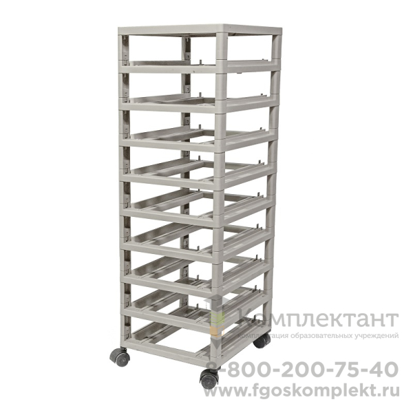 Стойка для лаборатории выполнена в виде литой конструкции из пластмассы с роликовыми колесами и имеет форму полочного стеллажа. Количество уровней стеллажа соответствует количеству контейнеров лаборатории. Стойка может быть выполнена в белом, сером или бежевом цвете.