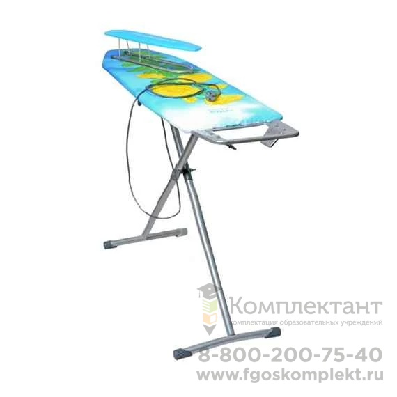 оснащается раскладной крестообразной подставкой, которая позволяет регулировать рабочую поверхность по высоте. Ножки защищены прорезиненными накладками, защищающими пол от царапания. Надежная конструкция позволяет доске стоять ровно и не шататься. Ножки шарнирно соединены между собой болтами, что позволяет складывать доску по окончании глаженья в плоскую конструкцию. Высота плавно регулируется с помощью рычажка и достигает 93 см.