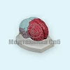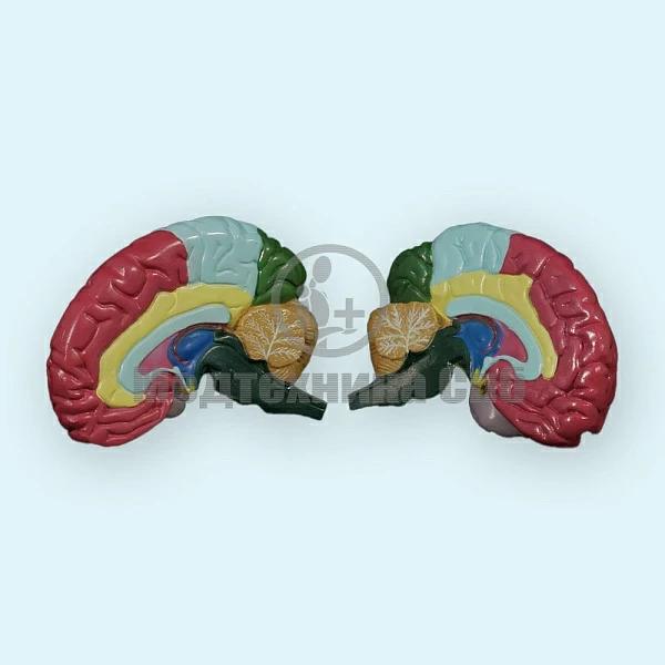 Модель головного мозга разделена пополам, каждая область окрашена в отдельный цвет. Представлены следующие области: лобная, теменная, затылочная и височная доли. Сагиттальный разрез мозга демонстрирует лимбическую систему, промежуточный мозг, средний мозг, продолговатый мозг, мозолистое тело и поясную извилину.