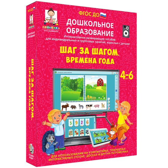 ШАГ ЗА ШАГОМ. ВРЕМЕНА ГОДА – интерактивное обучающее и развивающее пособие для индивидуальных и групповых занятий взрослых с детьми среднего и старшего дошкольного возраста по направлениям: социально-коммуникативное и познавательное развитие, представления об окружающем мире, социализация, связная речь, зрительное и слуховое восприятие, графические навыки, математические представления.