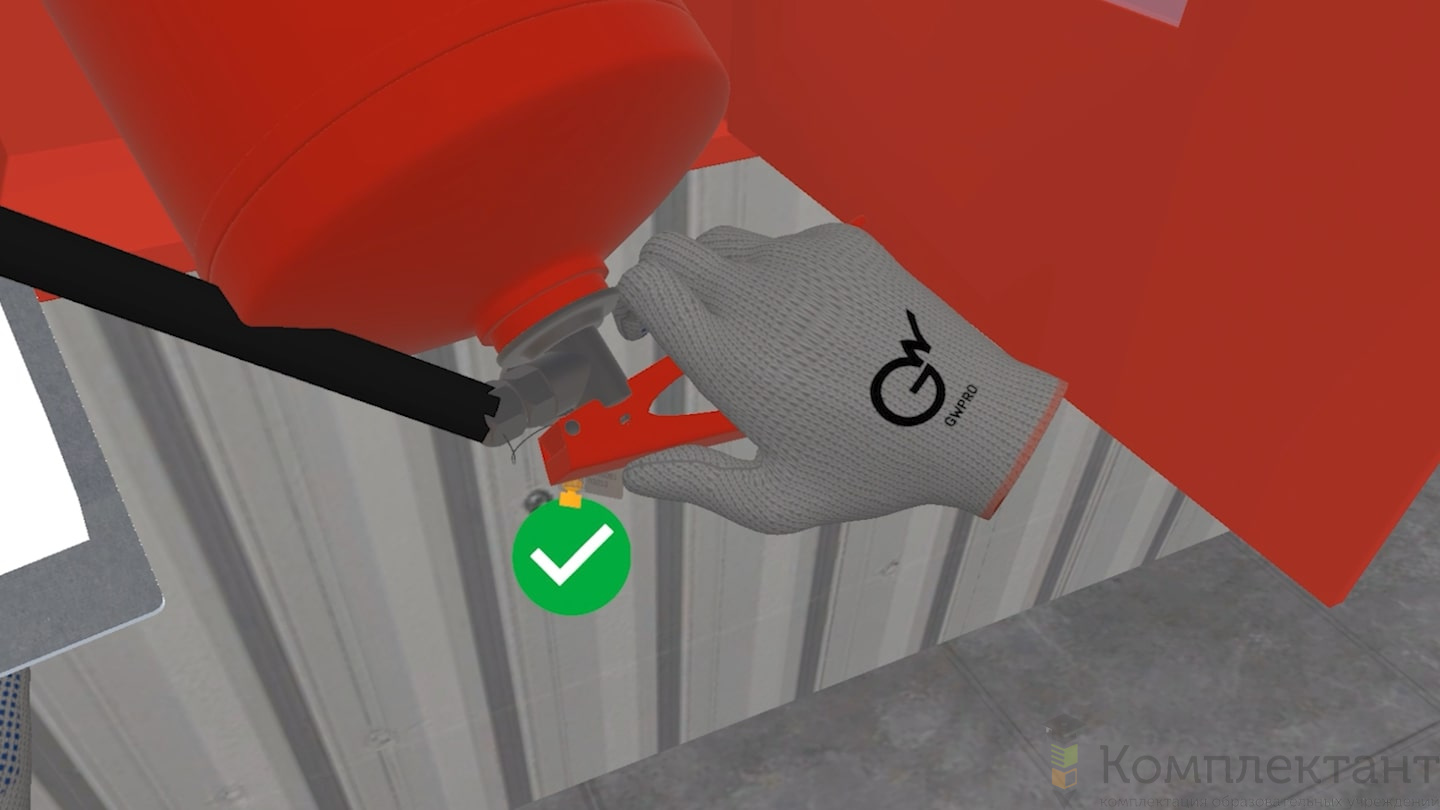 Виртуальный (VR) тренажер «Пожарная безопасность в цеху» воссоздает ситуацию возгорания в рабочем ангаре. Пользователю в процессе тренировки необходимо прекратить работу, вызвать пожарную охрану и, согласно плану, провести эвакуацию из ангара, а также применить огнетушитель.