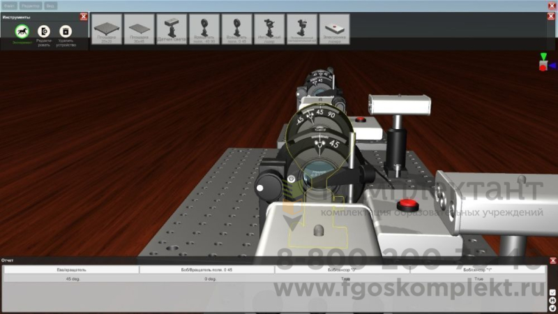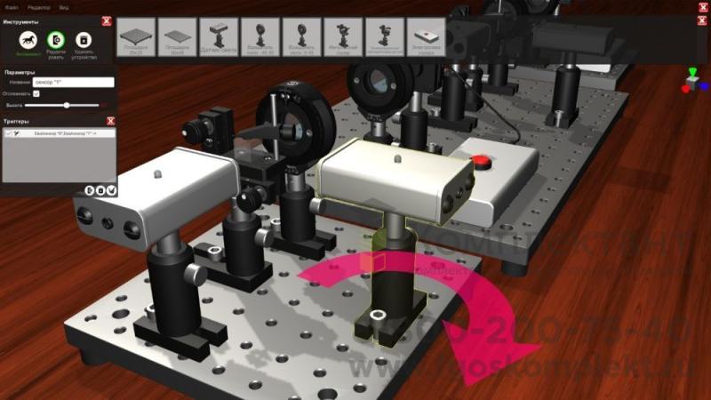 В режиме редактирования происходит сборка оптической системы из компонентов путем перетаскивания компонентов из списка каталога на рабочий стол или сборочную плату. Также существует возможность настройки параметров компонентов.