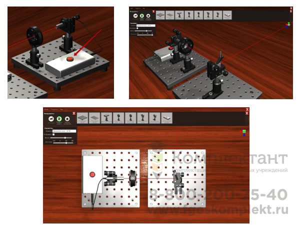 - и настраивается цель (другой компонент), при попадании в которую лучом лазера запускается активность, которая устанавливает заданные параметры у выбранного компонента. Например, можно задать параметр угла поляризации для выбранного вращателя поляризации на 45 градусов при попадании в один детектор, и 90 градусов — при попадании во второй. Настройка триггеров может помочь автоматизировать процесс эксперимента.