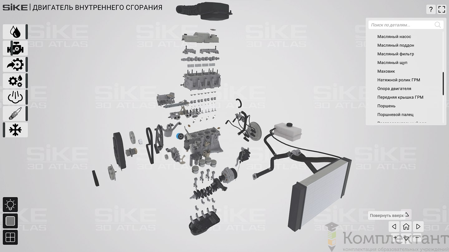 3D Атлас «Устройство двигателя внутреннего сгорания» дает возможность пользователю детально изучить устройства оборудования на базе реалистичных 3D моделей. В основе изучения интерактивные 3D модели реального производственного оборудования. В режиме «обучение» пользователь может вращать модель, скрывать отдельные детали, изучать внутреннее устройство, описание и назначение деталей. В режиме «тестирование» пользователь может проверить свой уровень знаний по конструкции оборудования.