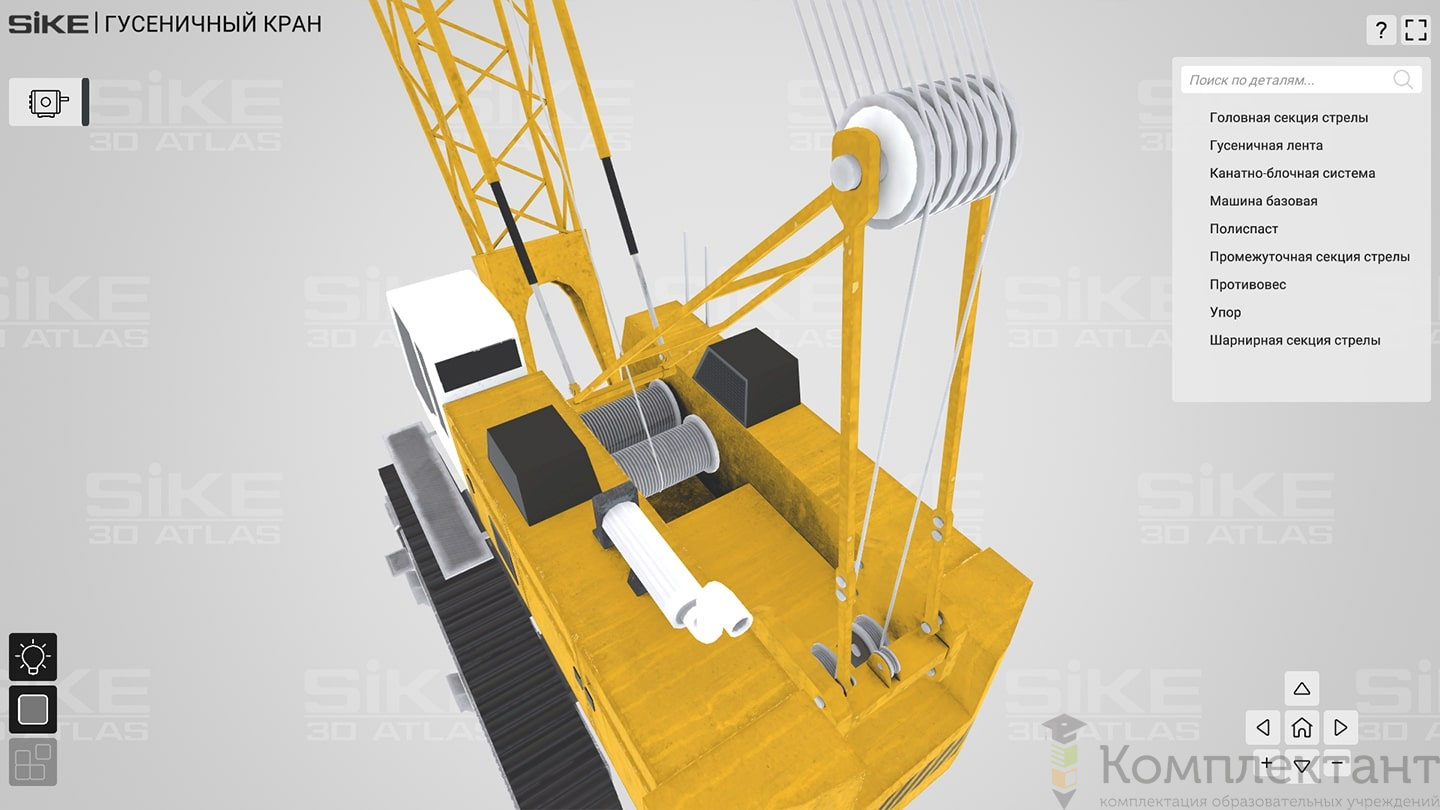3D Атлас «Устройство грузоподъемных механизмов» дает возможность пользователю детально изучить устройства оборудования на базе реалистичных 3D моделей. В основе изучения интерактивные 3D модели реального производственного оборудования. В режиме «обучение» пользователь может вращать модель, скрывать отдельные детали, изучать внутреннее устройство, описание и назначение деталей. В режиме «тестирование» пользователь может проверить свой уровень знаний по конструкции оборудования.