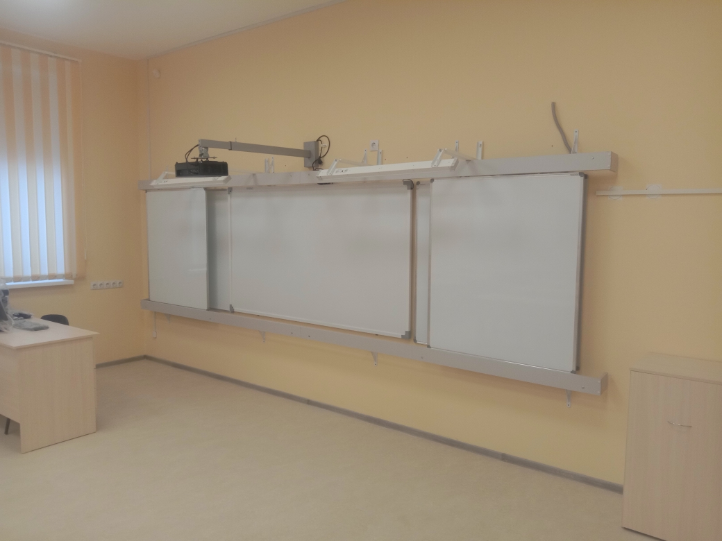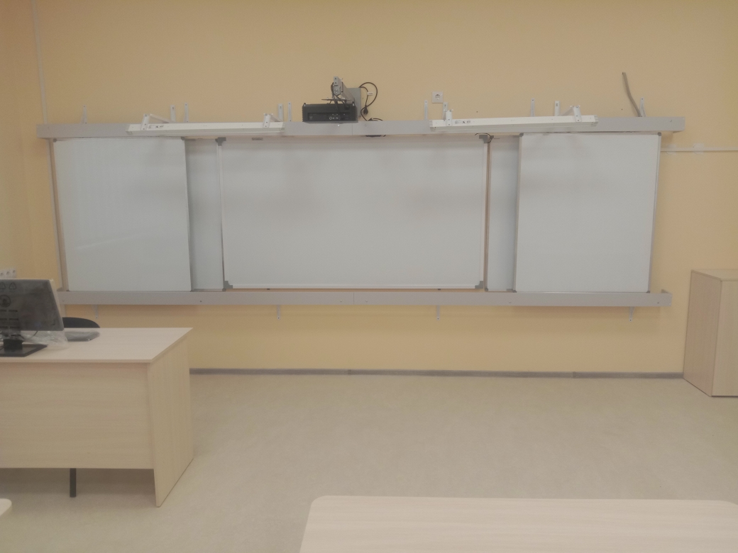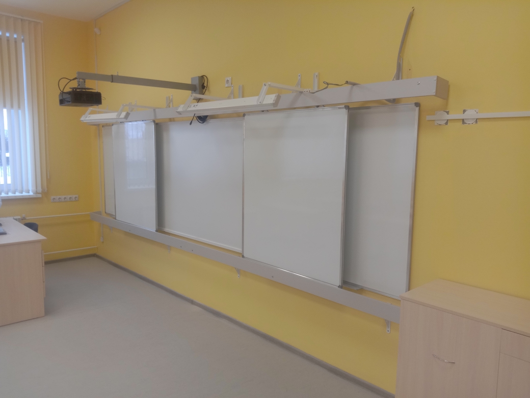 Рельсовая система (4м) с 2 передвижными меловыми и 2 статическими маркерными досками, интерактивной доской 82” 16:9, короткофокусным проектором и креплением
