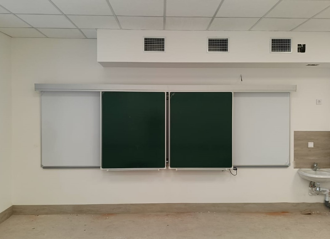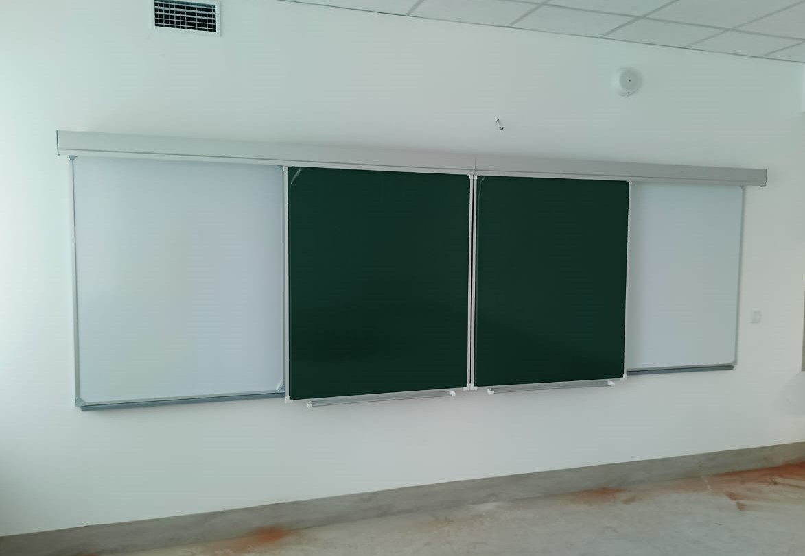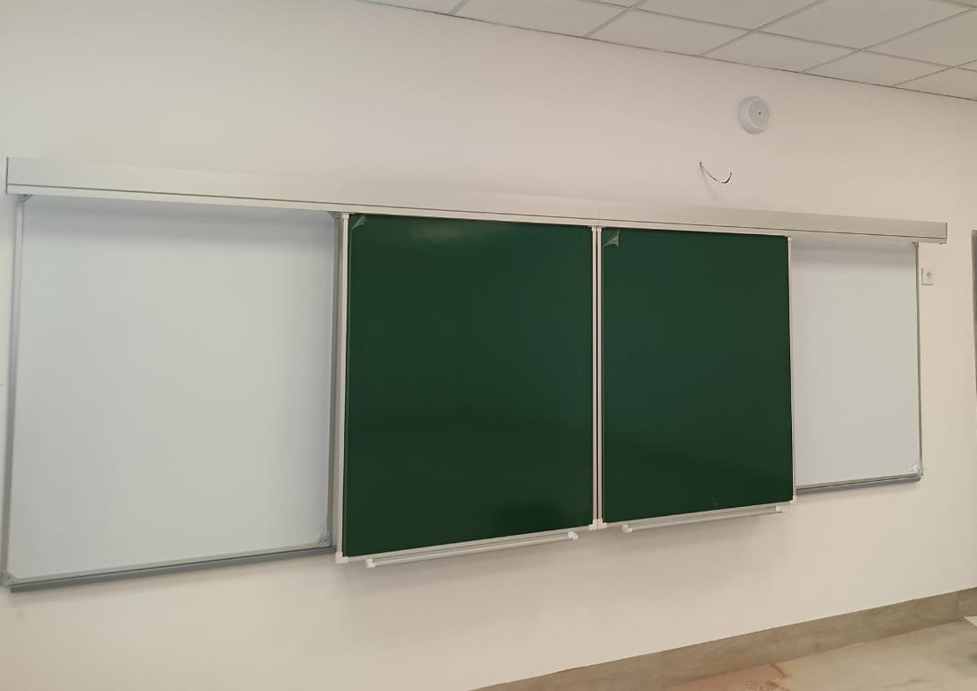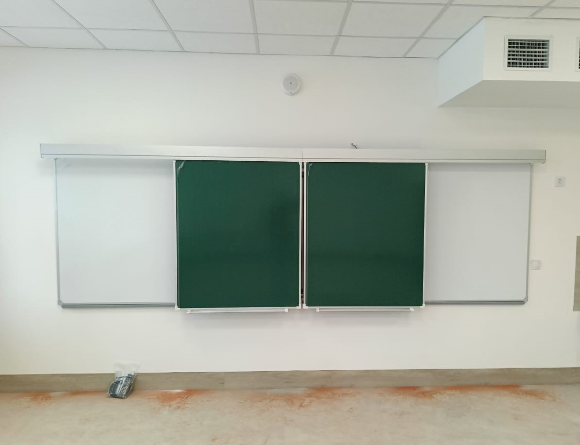 Компания «Комплектант» предлагает решение, позволяющее оптимально разместить 4 меловые доски и интерактивную панель.  При помощи рельсовой системы 2 подвижные доски раздвигаются,  позволяя использовать дополнительную площадь неподвижных.